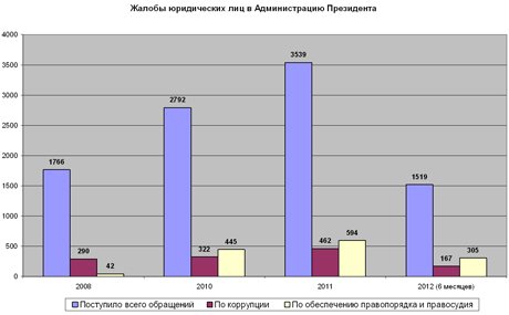 Начнем с жалоб в АП, являющейся высшим политическим органом страны. Жалуются туда, когда жалобы во все другие инстанции были неудачны. Посмотрим на количество жалоб юридических лиц - практически за каждым там стоит резонансное дело.