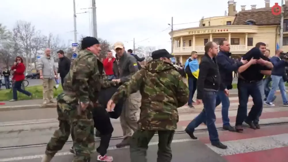Беспорядки возникли возле отеля "Проминада". Сторонники единой Украины собрались возле отеля, в котором находился кандидат в президенты страны Олег Царев, чтобы не выпустить политика, который собирался принять участие в пророссийской акции. "Позднее Царев уехал, но к отелю приехали с Куликова поля около 500 человек, большинство были в бронежилетах, с битами, палками, цепями. Они напали на евромайдановцев, избили несколько активистов и разбили автобус, увозящий женщин", - говорится в сообщении. Нападению также подверглись две съемочные группы.