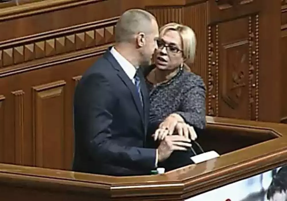 Депутат Рады ударил свою коллегу бутылкой по голове Андрей Тетерук и Александра Кужель Кадр из видео с сайта youtube.com