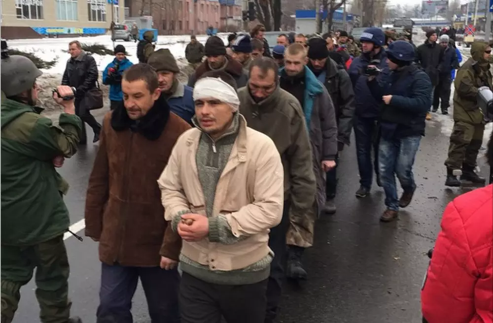 Днем 22 января ополченцы самопровозглашенной "Донецкой народной республики" выгнали на улицы Донецка украинских "киборгов", накануне взятых в плен в аэропорту Донецка. Об этом сообщают "Новости Донбасса".