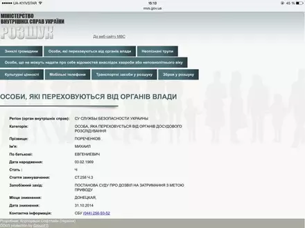 Данные о розыске Пореченкова расположены в разделе "лица, которые скрываются от органов досудебного расследования". "Пореченков Михаил Евгеньевич, 1969 года рождения, подозревается в совершении преступления, предусмотренного частью 3 статьи 258 Уголовного кодекса "Террористический акт или угроза его совершения", - указано на сайте МВД. Датой исчезновения украинские милиционеры считают 31 октября 2014 года - день пребывания Михаила Пореченкова на Украине.
