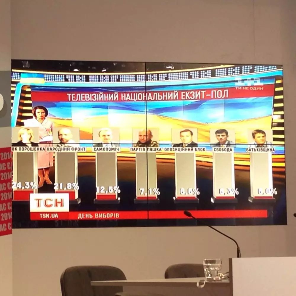 Согласно данным ТНС, Блок Петра Порошенко набирает 24,3 процента, за ним следует "Народный Фронт" премьер-министра Украины Арсения Яценюка с 21,8 процента, на третьем месте партия "Самопомощь" мэра Львова Андрея Садового, которая набирает 12,5 процента. Кроме того, в Верховную Раду проходит "Партия Ляшко" - 7,1 процента, "Оппозиционный блок" (бывшая Партия регионов) - 6,6 процента, партия "Свобода" - 6,3 процента и партия Юлии Тимошенко "Батькивщина" - 6,0 процента.