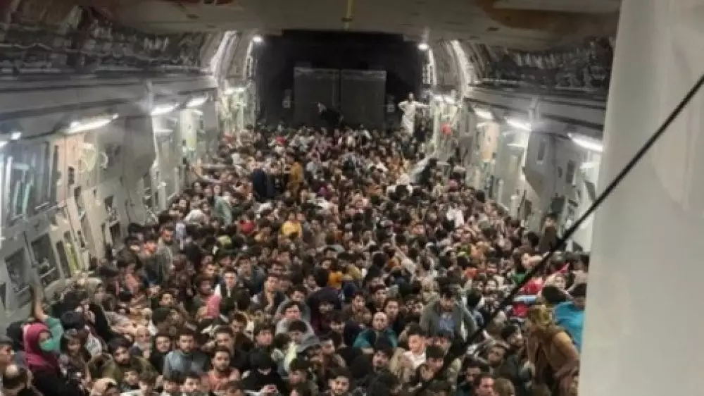 На фото запечатлен забитый людьми салон транспортного американского самолета, выполнявшего рейс из Афганистана в США. Отмечается, что изначально не планировалось брать такое количество людей на борт, но поток афганцев, желающих покинуть страну, остановить не удалось. В итоге, как пишет Вайсгербер, в салон самолета набились около 640 беженцев.