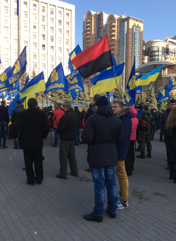 Члены партии "Всеукраинское объединение "Свобода" проводят митинг возле здания Центральной избирательной комиссии в Киеве, где проходит подсчет голосов на прошедших 26 октября внеочередных парламентских выборах, передает корреспондент Tengrinews.kz с места событий.