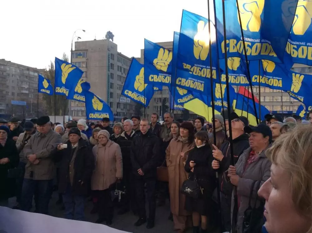Члены партии "Всеукраинское объединение "Свобода" проводят митинг возле здания Центральной избирательной комиссии в Киеве, где проходит подсчет голосов на прошедших 26 октября внеочередных парламентских выборах, передает корреспондент Tengrinews.kz с места событий.