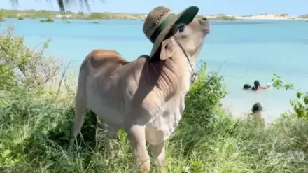 Настоящий фурор Арахис вызывает, когда фермер выгуливает его на поводке по пляжу вместе с другими собаками. Местных жителей удивляет и умиляет необычный теленок.