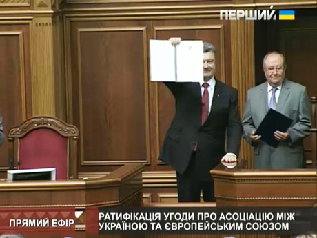 За соглашение об ассоциации Украины с ЕС проголосовали 355 народных депутатов Рады, а в Страсбурге его поддержали 535 евродепутатов. Оба парламента были на прямой видеосвязи. На голосовании присутствовали президент Петр Порошенко и премьер Арсений Яценюк. Ратификацию соглашения об ассоциации Украины с ЕС спикер Рады назвал "историческим шансом", который Украина "завоевала кровью". По словам главы МИДа Павла Климкина, после выполнения условий ассоциации Украина без проблем вступит в Евросоюз.