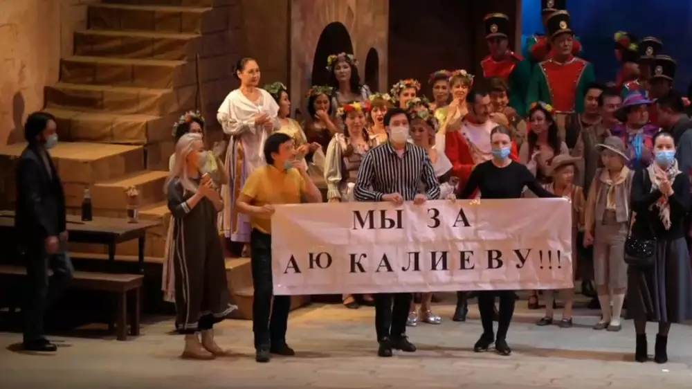 Артисты Казахского государственного академического театра имени Абая в Алматы после спектакля "Любовный напиток" вышли на поклон с плакатами в поддержку директора Аи Калиевой, которую сняли с поста накануне, передает корреспондент Tengrinews.kz.