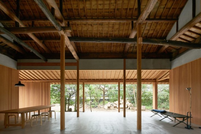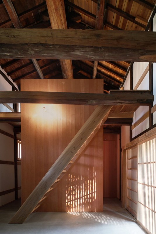 Дом находится в японском городе Курасики. Старинный дом восстановила строительная компания. Архитекторы придали ему современные черты и создали открытые пространства. При этом сохранили историческую крышу, установив под ней прочную конструкцию из деревянных колонн.