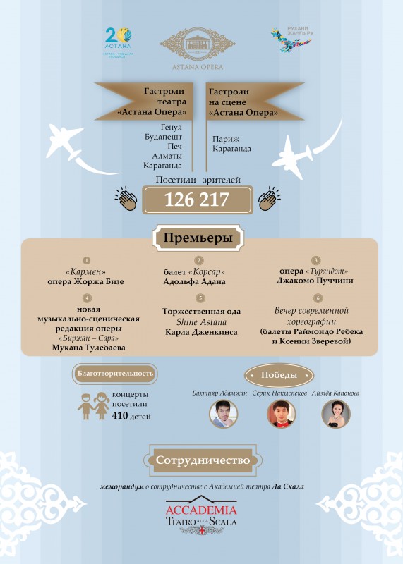 Масштабные проекты пятого, юбилейного сезона театра "Астана Опера" были посвящены 20-летию Астаны. Репертуар пополнили мировые шедевры оперного и балетного искусства. Все это - результат огромных усилий творческого коллектива крупнейшего театра страны под эгидой Министерства культуры и спорта, полномасштабно реализующего Концепцию культурной политики, утвержденную Президентом Казахстана Нурсултаном Назарбаевым.