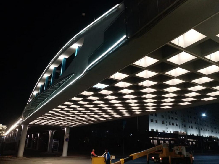Кроме того, декоративная светодиодная подсветка появилась под пешеходным мостом по проспекту Мәңгілік Ел. Прожекторы установлены в глубине ячеек в шахматном порядке и придают этому участку ночью особый уют и эстетику. Подсветка подключена к общему освещению моста и включается по таймеру (в 22.00).