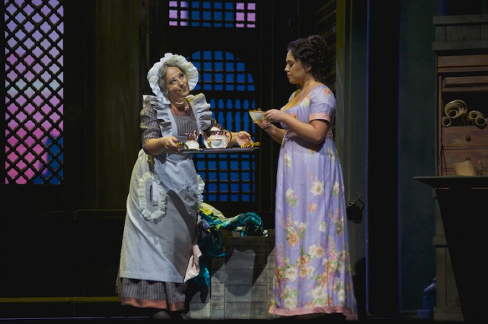 Благодаря последним современным технологиям Альфонсо Антониоцци смог воспользоваться в своей постановке рядом интересных режиссерских приемов, например "театр в театре", который в данном случае выражает содержательную суть оперы - все здесь игра: не стоит принимать за чистую монету все, что происходит на сцене. Это становится понятным в картине урока музыки, когда Розина (Салтанат Ахметова) поет, а на заднем фоне возникают  видеопроекции, изображающие роскошные ложи, создающие театральную атмосферу.