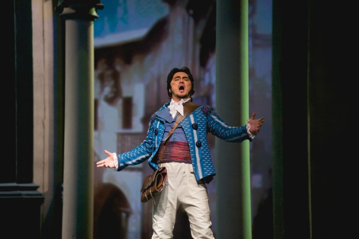 Когда на сцене появляется Фигаро (баритон Сундет Байгожин), он сразу же очаровывает слушателей своим обаянием, красотой и мощью голоса, остроумием и ловкостью. Зал подхватывал и подпевал вместе с артистом знаменитые арии главного героя. Плут Фигаро Байгожина получился легким, изящным и в меру пронырливым. Под стать ему была и Розина (сопрано Салтанат Ахметова), в соответствии с ролью озорна, кокетлива, она с легкостью создавала интриги вокруг себя. И в общем ее образ получился цельным как вокально, так и артистически. Певица меняла костюмы прямо на сцене, здесь нужно отдать должное художнику по костюмам Франке Скуарчапино, потому что все наряды артистов - не просто оригинальные, но еще и модные, они выглядят весьма актуально и в наши дни.