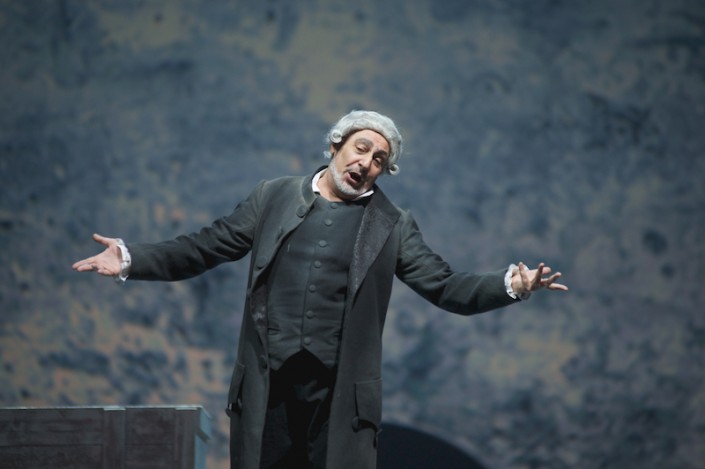 Богатая сценография на протяжении всего спектакля поражает своим великолепием взоры публики. За окнами масштабного итальянского дома происходят постоянные перемены: то порывистый ветер гнет деревья, то льет проливной дождь, а еще зрителей радуют роскошные пейзажи города, пышно цветущие растения и корабли. У каждой картины есть свое значение: явления природы передают настроение героев. Так, ливень начинается, когда граф пытается освободить свою возлюбленную из-под гнета Бартоло, гром и молния, изображенные на 4D-проекции в сцене "Клевета", аллегорически говорят нам о магической силе слова, которое может уничтожить репутацию любого человека. В финальной сцене  зарево фейерверков заливает золотым цветом все пространство площади. Салюты - символ радости - сопровождают приезд графа Альмавивы вместе со своей возлюбленной Розиной на удивительно роскошной карете. В каждой из этих сцен читается неизменно тонкое чувство стиля Эцио Фриджерио. Особый почерк мастера узнается и в колоннах, выполненных в сине-золотом цвете, передвигаются они плавно, в автоматическом режиме, будто танцуют под искрометную музыку Россини.