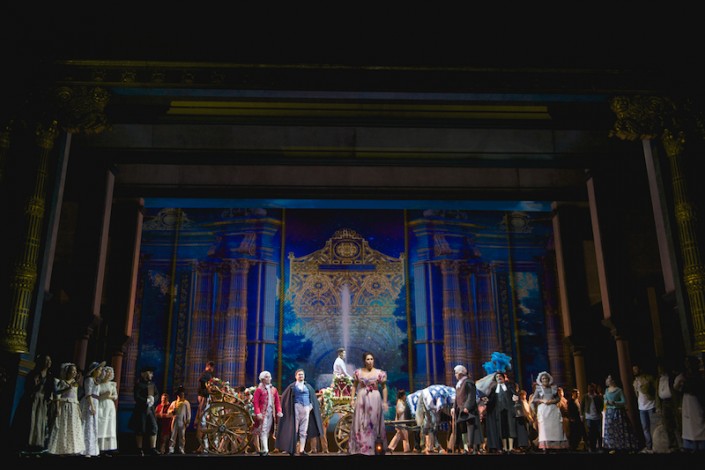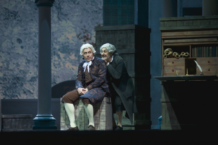 Богатая сценография на протяжении всего спектакля поражает своим великолепием взоры публики. За окнами масштабного итальянского дома происходят постоянные перемены: то порывистый ветер гнет деревья, то льет проливной дождь, а еще зрителей радуют роскошные пейзажи города, пышно цветущие растения и корабли. У каждой картины есть свое значение: явления природы передают настроение героев. Так, ливень начинается, когда граф пытается освободить свою возлюбленную из-под гнета Бартоло, гром и молния, изображенные на 4D-проекции в сцене "Клевета", аллегорически говорят нам о магической силе слова, которое может уничтожить репутацию любого человека. В финальной сцене  зарево фейерверков заливает золотым цветом все пространство площади. Салюты - символ радости - сопровождают приезд графа Альмавивы вместе со своей возлюбленной Розиной на удивительно роскошной карете. В каждой из этих сцен читается неизменно тонкое чувство стиля Эцио Фриджерио. Особый почерк мастера узнается и в колоннах, выполненных в сине-золотом цвете, передвигаются они плавно, в автоматическом режиме, будто танцуют под искрометную музыку Россини.