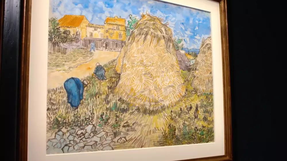 Речь идет о картине, которую Ван Гог написал акварелью, - Meules de blé ("Стога сена в Провансе"). На ней изображена сцена сбора урожая: женщины, работающие на полях во французском муниципалитете Арле. Christieʼs отмечает, что акварель демонстрирует одержимость Ван Гога "японизмом", он принял более графический стиль, подобный японским ксилографиям (гравюры на дереве).