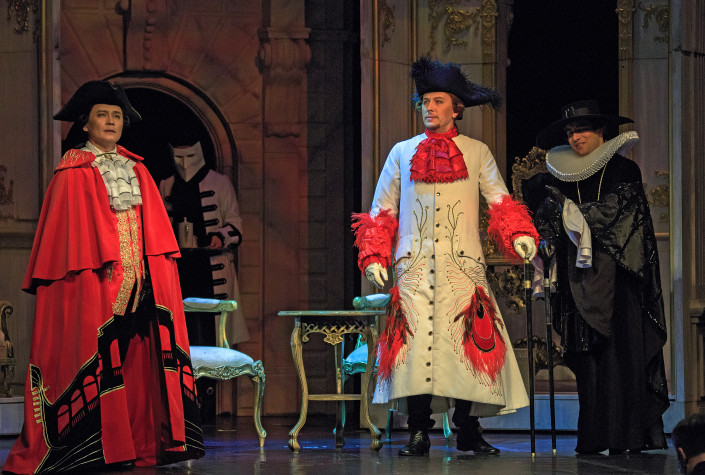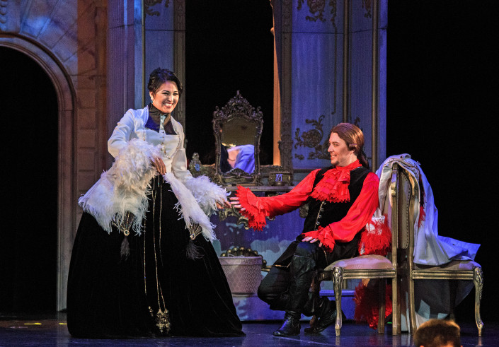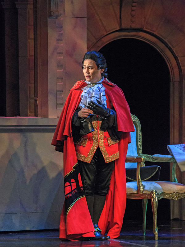 Высокий красавец Евгений Чайников в белоснежном камзоле, украшенном перьями и затейливой вышивкой - самовлюбленный дамский угодник Бланзак, который в итоге легко утешился заменой несостоявшейся невесты Джулии на влюбленную в него Лючиллу. Внешняя импозантность вкупе с сочным басом и отличной игрой сделали образ его героя запоминающимся.