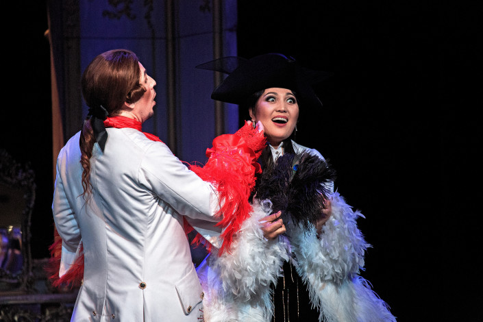 Опера-фарс предполагает не только прекрасное пение (bel canto), но и столь же прекрасную актерскую игру. И казахстанские артисты на сцене просто получали удовольствие. Заслуженная артистка Казахстана Жаннат Бактай в образе Джулии - очаровательная кокетливая красавица. Певица легкость, грациозность и веселый нрав героини передала великолепным исполнением вокальной партии - технически сложной, но изящной, насыщенной музыкальными мелизмами и виртуозными пассажами, характерными для оперы барокко.