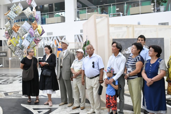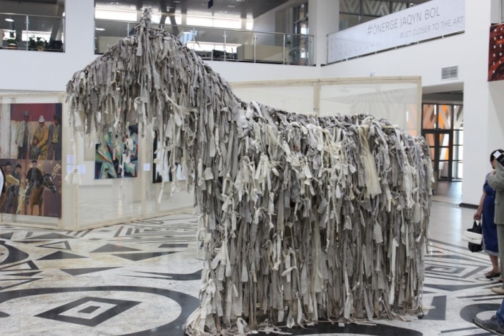 Далее зрители смогут увидеть "Подушки" от Сауле Дюсенбиной. Это множество воздушных подушек, на которых изображены батыры, животные. Зефирная экспозиция, вытянутая с самого потолка до пола, повествует о такой проблеме, как гибель животных.