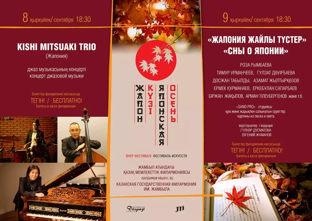 В этом году в рамках фестиваля "Японская осень" в Государственной филармонии имени Жамбыла пройдут два концерта. 8 сентября выступят мастера джаза из Японии - трио Киши Мицуаки. Лидер группы Мицуаки широко известен в мире джаза, он является обладателем премии Selective Gold Disc журнала Swing. Для казахстанского зрителя команда готовит музыкальный сюрприз. Музыканты исполнят казахскую народную мелодию в джазовой интерпретации.