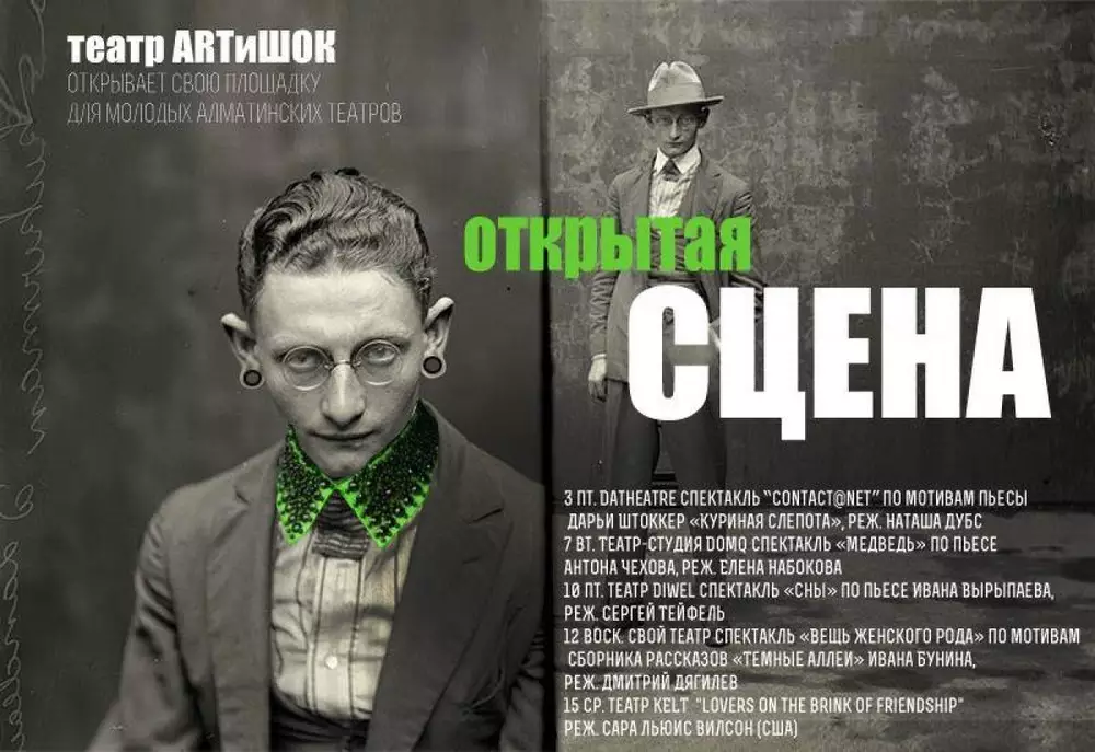 На две недели "АРТиШОК" отдаст свою сцену пяти разным театрам Алматы - DAtheatre (3 октября), "Дом Q" (7), diWel (10), "Свой" (12) и KELT (15). Театры продемонстрируют свои лучшие спектакли. К примеру, зрители смогут увидеть скандальную пьесу "Сны" Ивана Вырыпаева, режиссером-постановщиком которой выступил Сергей Тейфель, легкую и забавную историю "Медведь" по пьесе Антона Чехова театра-студии "Дом Q" и спектакль "Влюбленные на грани дружбы" на английском языке от театра KELT.