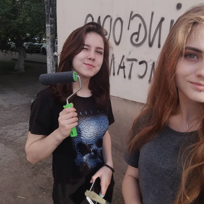 Ольга Валерова и Алина Журавлева раскрашивают третью по счету стену многоэтажного дома в Уральске. На ней красовалась надпись с рекламой синтетических наркотиков. Девушки говорят, что с каждым годом подобных надписей становится все больше.