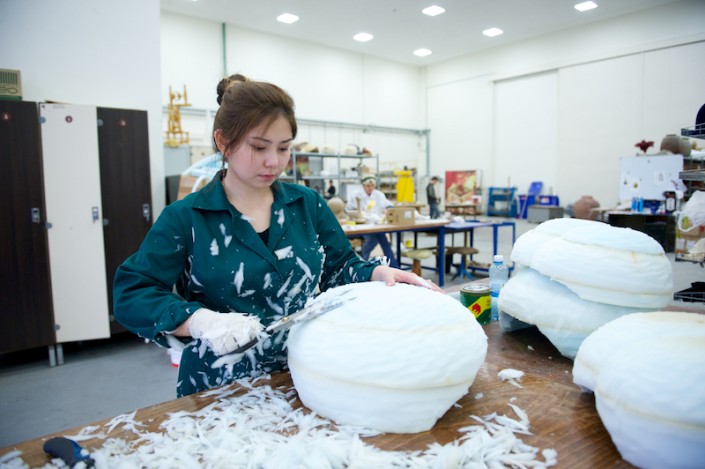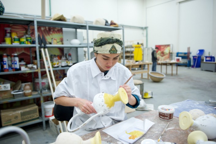 Вот сверкают блеском фарфора изготовленные кувшины, бокалы и чаши необычных форм. К слову, изогнутые линии создать совсем нелегко, хотя техника осталась прежней: папье-маше. А копья, клинки, ножи и другое декорированное оружие сделаны с применением новой технологии – работы с непростым материалом – ворблой, в основе которого лежит сочетание древесных опилок с полимером. Реквизит дает имитацию настоящих деталей, но все они облегчены и удобны для исполнителей, которым то и дело приходится доставать сабли из ножен, играть на инструментах. К примеру, струнный, сделан в виде павлина. Однако, звуки барабана, бубенцов и др. могли бы помешать во время спектакля, поэтому, применив специальный метод, их устранили.