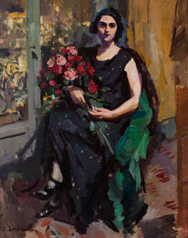 Вторая его работа – "Девушка с букетом роз". Это не первый портрет Коровина, который он создает в интерьере при искусственном вечернем освещении. Свет от электрической лампы усиливает контраст ярко освещенных и затененных поверхностей, что позволяет художнику выявить объем модели, более скульптурно показать пластику ее тела. В руках девушки огромный букет роз - цветов, которые художник особенно любил и постоянно вводил в свои композиции, будь то натюрморт или, как в данном случае, портрет. А за окном – все тот же ночной Париж!