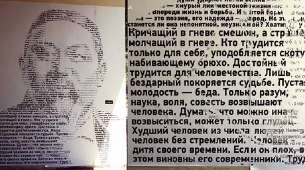 В работе использованы цитаты великого поэта, а также текст из книги "Путь Абая" Мухтара Ауэзова. Как рассказали в рекламном агентстве, создавшем портрет, пока серия подобных граффити планируется только в Алматы, однако не исключено, что в будущем стихи Абая появятся в других городах. Всего запланированы три портрета выдающихся казахских деятелей, однако чьи цитаты будут использованы в остальных двух работах, пока не известно.