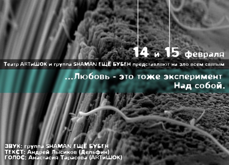 Постановка основана на цитате из стихотворения Андрея Лысикова, также известного как музыкальный исполнитель Дельфин "Любовь - это тоже эксперимент/Над собой". Во время творческого вечера актриса "АРТиШОКа" Анастасия Тарасова, которая является автором проекта, а также приглашенные музыканты создадут атмосферу историй, которые "живут" в стихах.