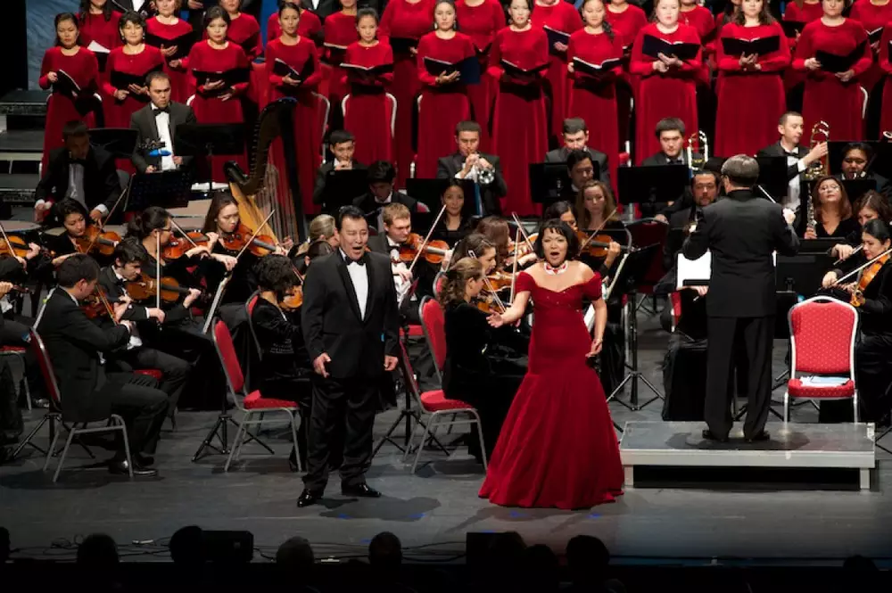 Творческая элита театра - Жупар Габдуллина, Медет Чотабаев и Барсег Туманян исполнили отрывки из крупных произведений выдающихся композиторов Джузеппе Верди, Камиля Сен-Санса, Джакомо Пуччини и Вольфганга Моцарта. Завершило первое отделение премьерное исполнение артистами театра "Астана Опера" сцены Триумфа из оперы "Аида" Джузеппе Верди.