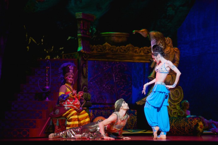 Все артисты виртуозно справились со своими партиями. Роль Шахриара представили Жанибек Иманкулов и Рахметулла Науанов, солисты сделали ее актерски великолепно. Зобеиду исполняли Анастасия Заклинская и Заслуженный деятель Казахстана Гаухар Усина. Обе артистки показали ее по-своему: откровенная гибкая пластика А. Заклинской впечатляла, балерина сумела передать образ восточной красавицы. Гаухар Усина вложила в свою героиню много чувств, ее Зобеида получилась яркой и эмоциональной. Шахезмана исполнили Ильдар Шакирзянов и Ерлан Жамбулаев. Золотой раб - одна из ключевых партий - был великолепно воплощен Бахтияром Адамжаном, во второй день в этой роли прекрасно выступил Арман Уразов. Главный евнух - Олжас Маханбеталиев, Рахметулла Науанов. Одалиски - Молдир Шакимова, Аделина Тулепова, Еркежан Жунусова, Марико Китамура, Сэйка Тоносаки, Назира Заетова.