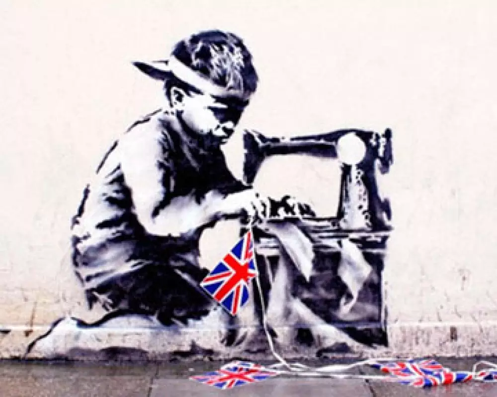 На граффити под названием "Рабский труд" изображен мальчик, склонившийся над швейной машинкой за вышивкой украшения из британских флагов. Эта работа появилась на стене одного из домов в районе Харингей на севере Лондона в мае прошлого года.