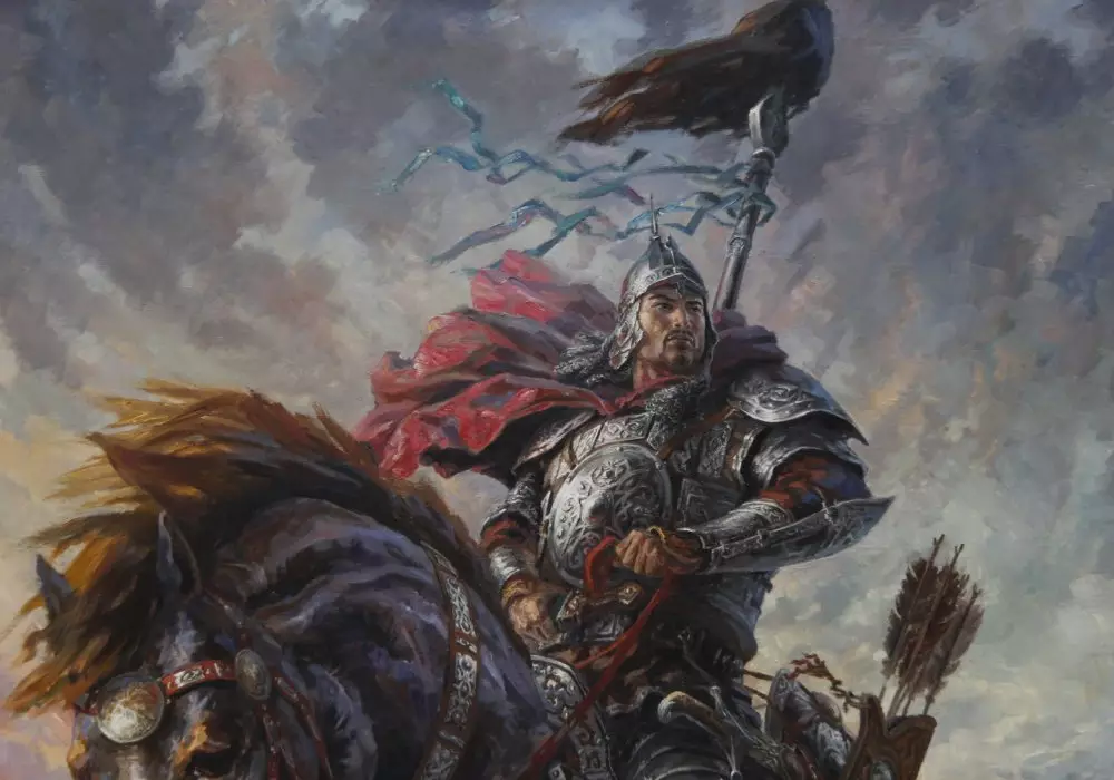 "В картине "Утро перед битвой" мне хотелось показать воина. Молодого, но в его глазах чувствуется, что он познал и горечь потерь, и вкус победы. Он понимает, что за ним родная земля, его близкие. (...) Я хотел передать атмосферу того времени - холодного дождя, гор, жайляу, воинов, которые уходят на бой с надеждой вернуться. Бирюзовый цвет олицетворяет очищение перед боем", - рассказал художник.