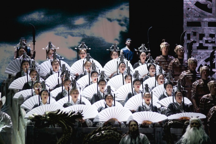 Впрочем, и звучание хора "Астана Опера" было безупречным. Главный хормейстер театра, Заслуженный деятель Казахстана Ержан Даутов продолжает держать марку экстраординарного хора. Известно, что это хоровая опера, поэтому на нем здесь сделан особый акцент. Удивительно, что артисты могли петь и одновременно, мастерски владея веерами, то открывать их синхронно, то в такт музыке попеременно создавать при помощи них красивые белые волны. Важно отметить работу детского хора под руководством Алтынганым Ахметовой. Словно ангелы, тоненькими голосами пели они, прося Турандот открыться любви. Юные артисты находились на балконах, их пение доносилось прямо из зала и создавало неповторимую атмосферу.