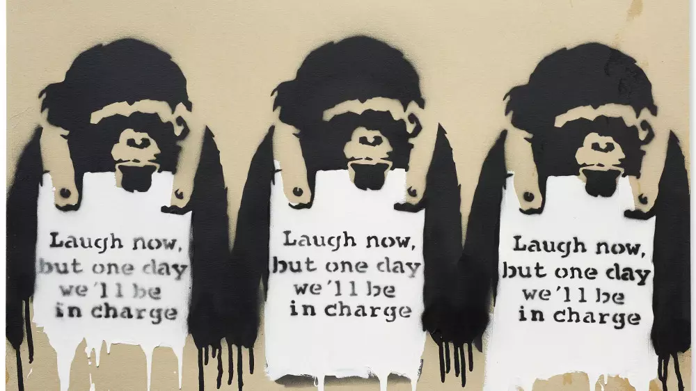 Речь идет о картине Laugh Now But One Day We'll Be In Charge ("Смейся сейчас, но однажды править будем мы") с изображением трех обезьян. Картина была создана в 2002 году на листе картона размером 76 на 102 сантиметра.