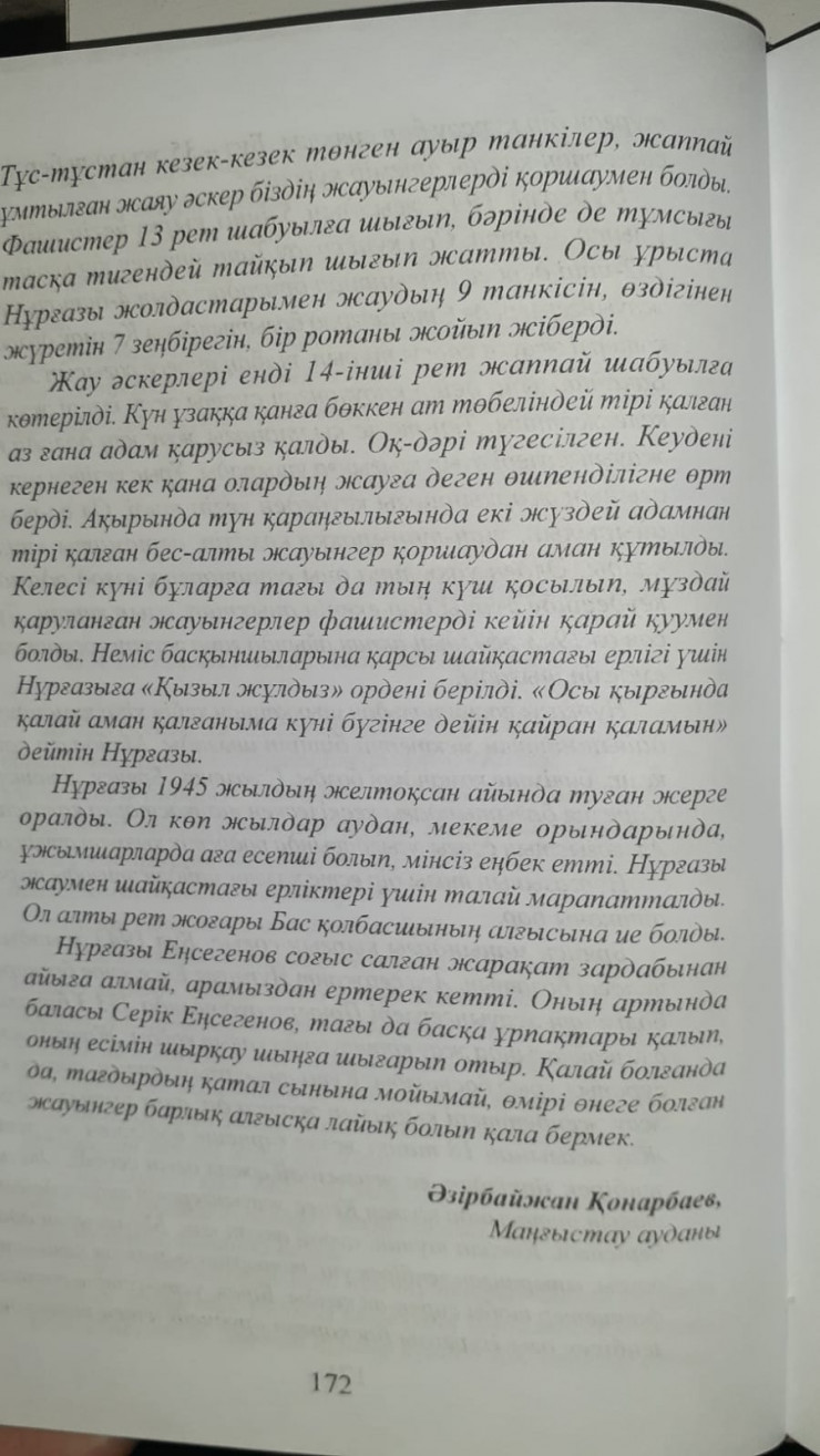Өз кітабында Еңсегенов Нұрғазы былай деп жазады: "Егер СССР мен Финляндия арасындағы бітім 7/Х-44 жылы болған болса, таза ұрыста болған күнімнің саны 300-ден асады. 1945 жылы 13 апрельде Вена қаласын алуға қатыстық. Осы үшін "За взятие Вены" және "За боевые заслуги" медальдарымен наградталдым".