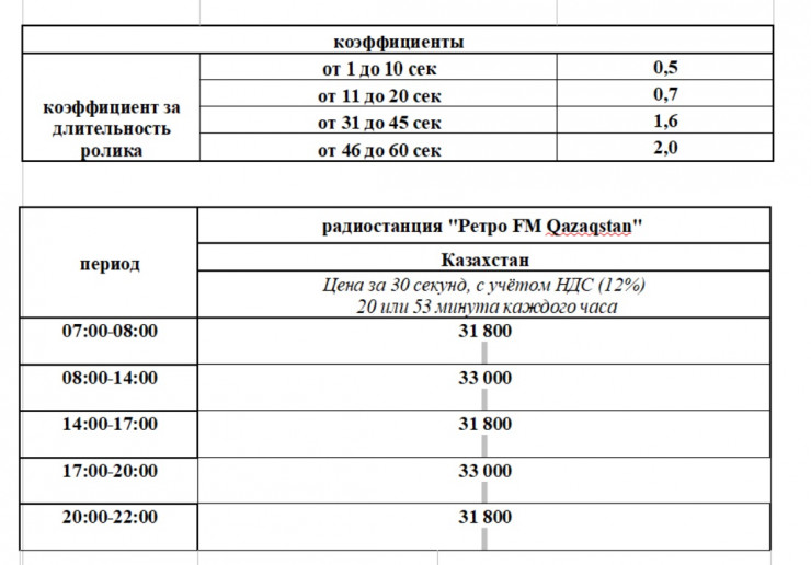 Предоставление эфирного времени на Радио осуществляется путем размещения аудиороликов, хронометражем не более 60 (шестидесяти) секунд на государственном и русском языках.