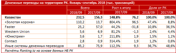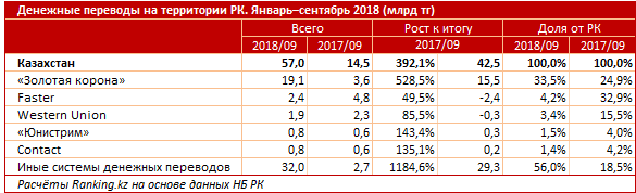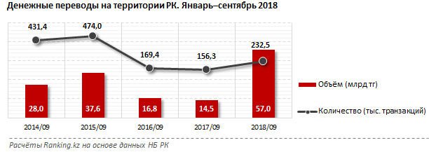 За три квартала 2018 года казахстанцы перевели друг другу по РК через системы международных денежных переводов 57 миллиардов тенге - это почти вчетверо больше, чем год назад, передает корреспондент Tengrinews.kz со ссылкой на Ranking.kz.