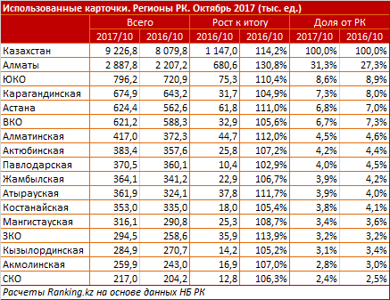 Среди регионов РК самое большое количество активных карт в Алматы - 2,9 миллиона единиц. Рост за год на 30,8 процента (680,6 тысячи). Доля от РК увеличилась с 27,3 процента до 31,3 процента.