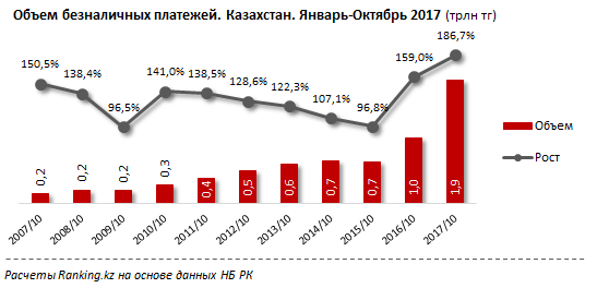 Рекордный за десять лет рост объема безналичных платежей произошел в течение 2017 года в Казахстане, сообщается в исследовании Ranking.kz.