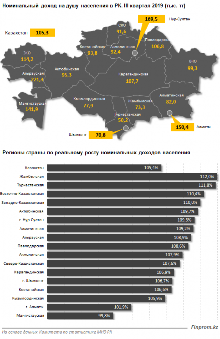 Максимальное значение среднедушевых номинальных денежных доходов населения в третьем квартале 2019 года зафиксировано в Атырауской области: 221,3 тысячи тенге, показатель превысил среднереспубликанский уровень более чем в два раза. Реальный рост номинальных доходов в регионе составил 8,9 процента за год.