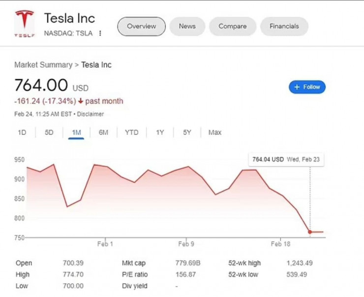 За последние четыре месяца миллиардер потерял около 140 миллиардов долларов. По состоянию на 25 февраля стоимость Tesla оценивается примерно в 789,64 миллиарда долларов, что почти на 30 процентов меньше, чем в ноябре.