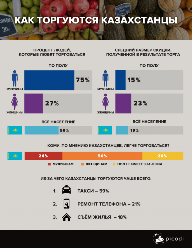 Что касается казахстанцев, то, как следует из результатов опроса, каждый второй признался, что любит торговаться. При этом мужчины чаще заявляли, что им нравится торговаться, по сравнению с женщинами (75 процентов против 27 процентов соответственно).