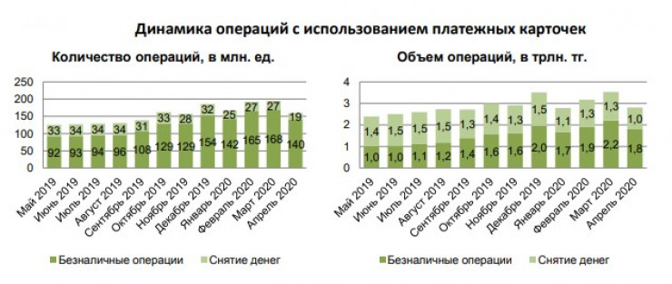 Отметим, что в начале года наблюдался рост показателей. Так, в январе - апреле 2020 года держателями платежных карточек проведено 714,6 миллиона операций на сумму 12,3 триллиона тенге. Эти цифры на 72 и 53 процента, соответственно, больше аналогичного периода 2019 года.