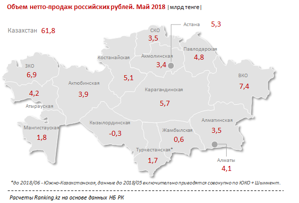 По объему продаж рубля населению лидируют: Восточно-Казахстанская область - 7,4 миллиарда тенге, Западно-Казахстанская область - 6,9 миллиарда тенге и Карагандинская область - 5,7 миллиарда тенге.