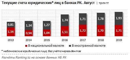 Казахстанцы все чаще предпочитают использовать текущие счета в банках второго уровня. В конце августа 2019 года сумма средств, лежащих на текущих счетах юридических лиц, составила 3,6 триллиона тенге, это на 4,5 процента больше, чем год назад. Тогда этот показатель был равен 3,5 триллиона тенге.