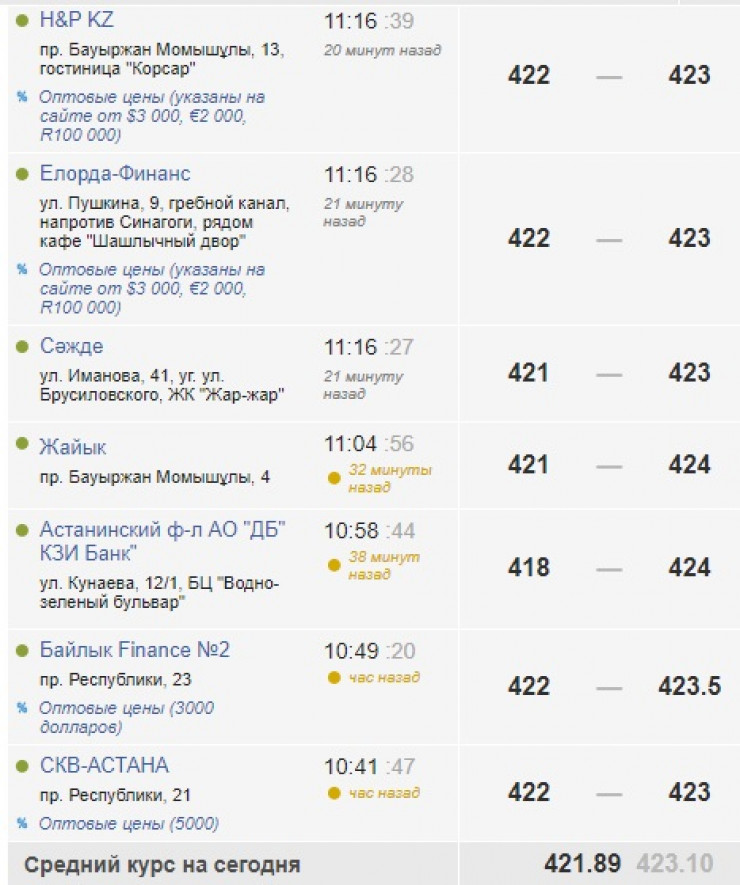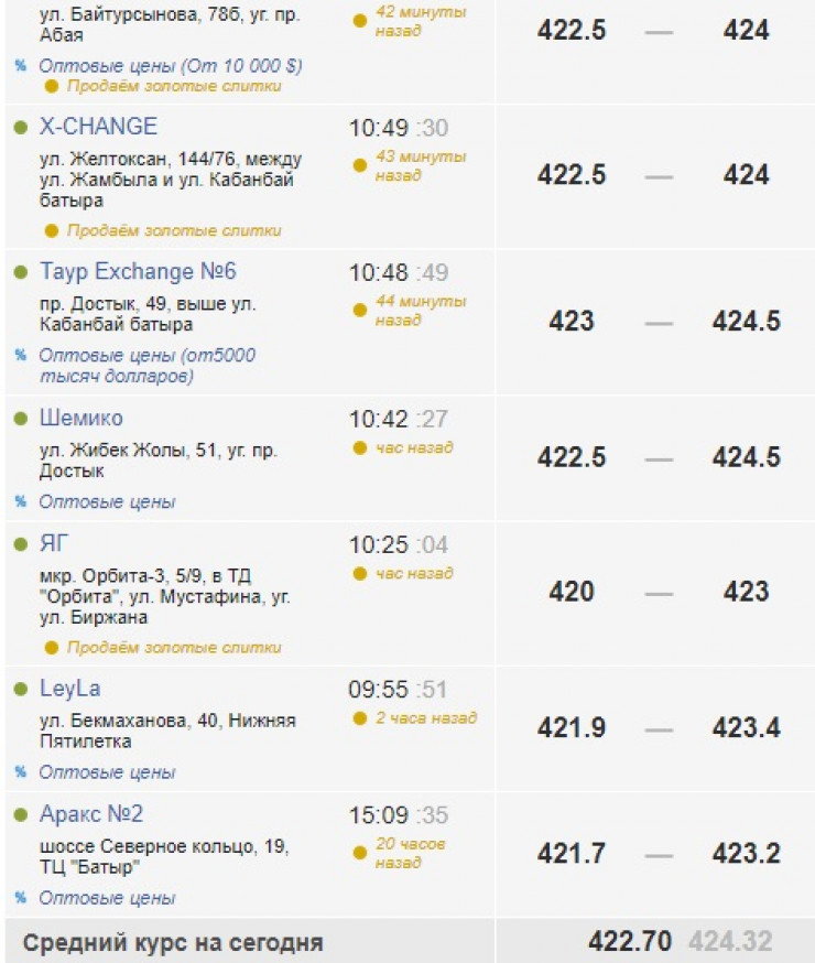 Курс доллара в обменниках Алматы. Скриншот с сайта Kurs.kz