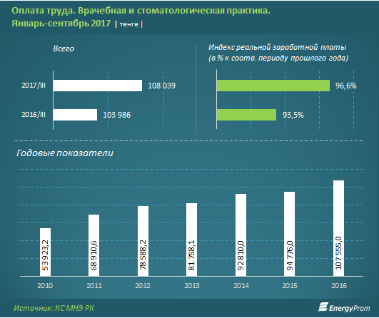 Так, среднемесячная заработная плата в секторе по итогам января-сентября 2017 года составляла 108 тысяч тенге - это всего на 3,9 процента больше, чем в аналогичном периоде годом ранее. То есть с учетом инфляции покупательная способность заработных плат сократилась на 3,4 процента год-к-году.