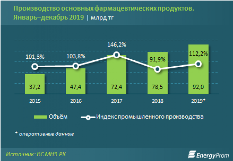 Производство непосредственно лекарственных препаратов за январь - декабрь 2019 года достигло 81,3 миллиарда тенге, прочих фармацевтических препаратов - 5,2 миллиарда тенге.